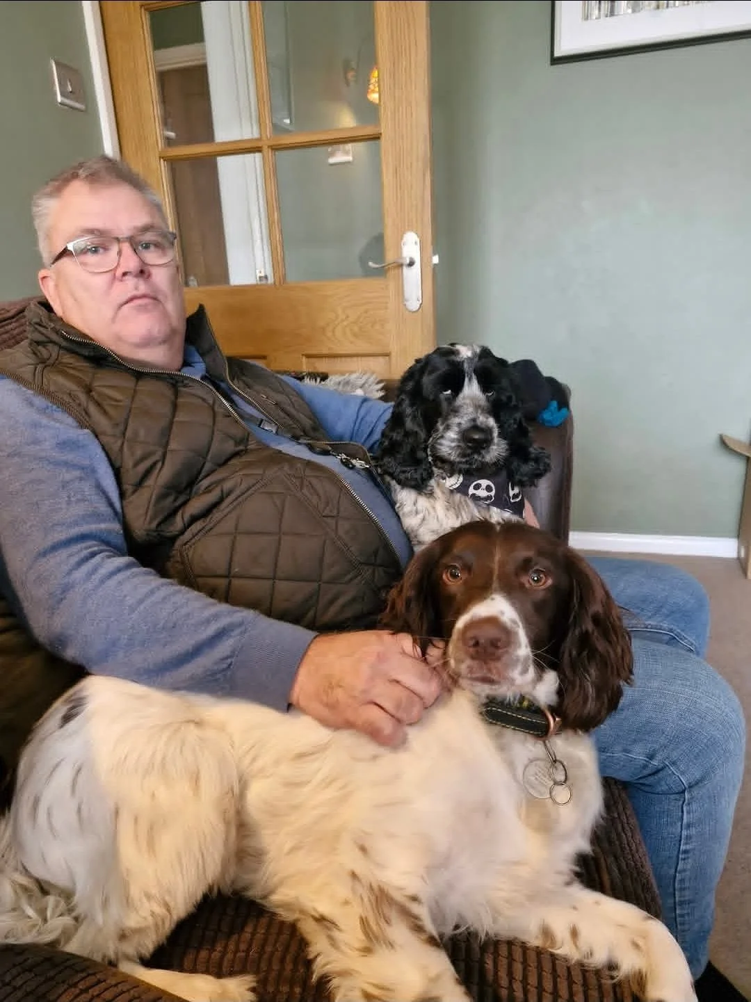 Dave sitting in his favourite place with our two beloved dogs, Margot the diva Cocker Spaniel and Willie the best behaved Springer ever! A very rare moment relaxing.. Dave loves his Grand Prix- when he gets time to watch it! Tottenham football team and a nice glass of Red Wine. He also loves to cook a mean Roast Dinner.